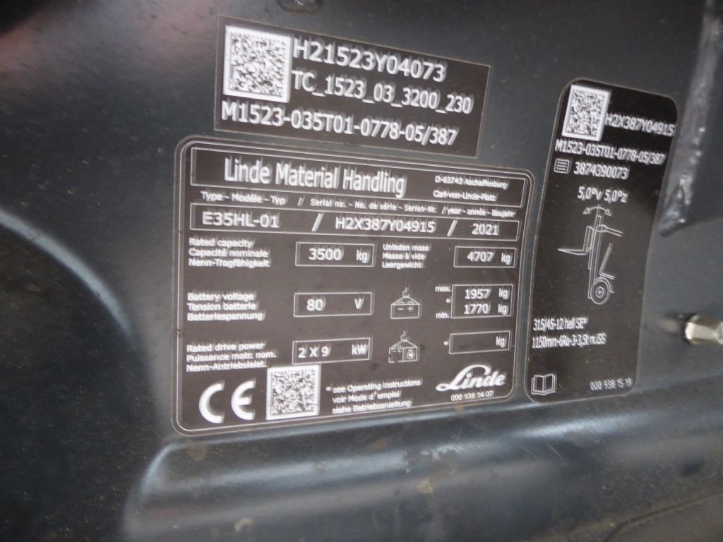 Hersteller: Linde Typ: E35HL-01 Bauart: Elektro 4 Rad-Stapler Antriebsart: Elektro Tragkraft: 3500 kg Baujahr: 2021 Stunden: 6495 Zustand: gut |