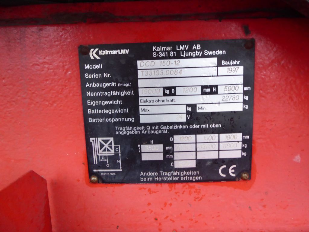Hersteller: Kalmar Typ: DCD 150-12 Bauart: Dieselstapler Antriebsart: Diesel Tragkraft: 15000 kg Baujahr: 1997 Stunden: 9891 Zustand: gut |